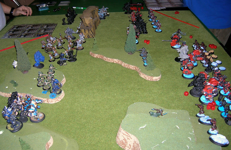 The Halfjacks became mines (4"AOE, power 14). The Stormguard would hold this side so effectively that they never get to hit a thing in the whole game. The Khador cavalry will break to the left, following after Boomhowler's Company.